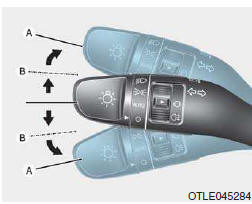 Baissez le levier de commande pour indiquer que vous tournez à gauche et levez-le pour indiquer que vous tournez à droite (A). Pour signaler un changement de voie, actionnez le clignotant approprié et maintenez-le en position (B). Le levier retrouve sa position initiale lorsque vous le relâchez ou une fois que vous avez tourné.
