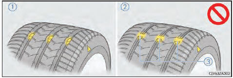 L'emplacement des indicateurs d'usure moulés est indiqué par le repère "TWI" ou "Δ" (ou autre) moulé sur le flanc de chaque pneu.Remplacez les pneus si les indicateurs d'usure moulés apparaissent sur un pneu.